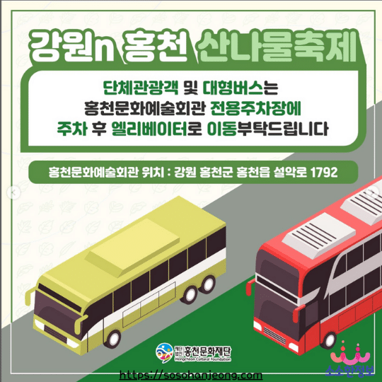 🚌 단체관광객 및 대형버스는 홍천문화예술회관 전용주차장을 이용해 주세요. 엘리베이터를 통해 행사장으로 편리하게 이동할 수 있습니다.