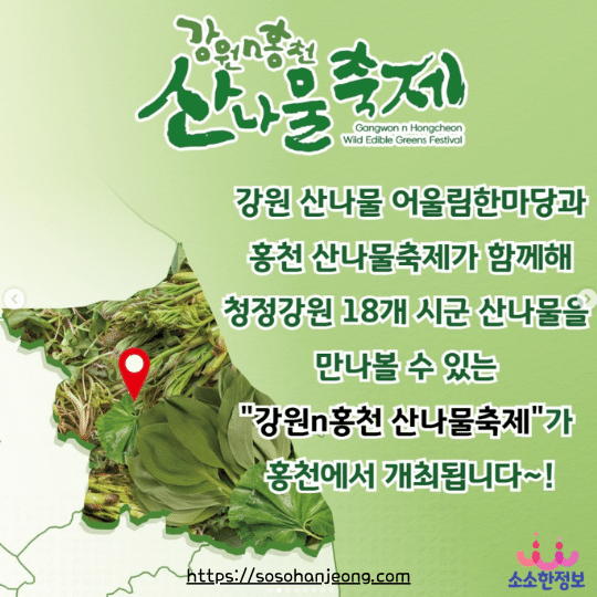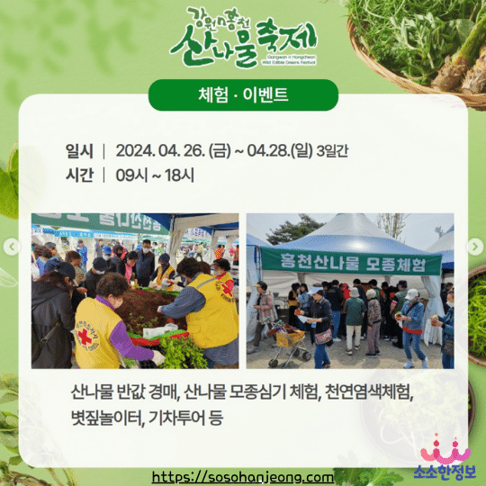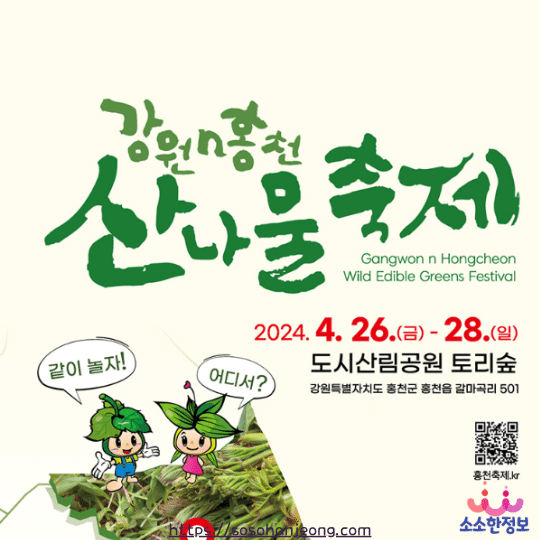 강원 홍천 산나물 축제(강원 n 홍천산나물축제)는 4월 26일부터 28일까지 3일 동안 도시산림공원 토리숲에서 개최되며,