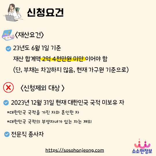 *단독가구가 아닐 경우 가구원 모두가 소유하고 있는 재산 합계액이 2.4억 원 미만 시 신청 가능
