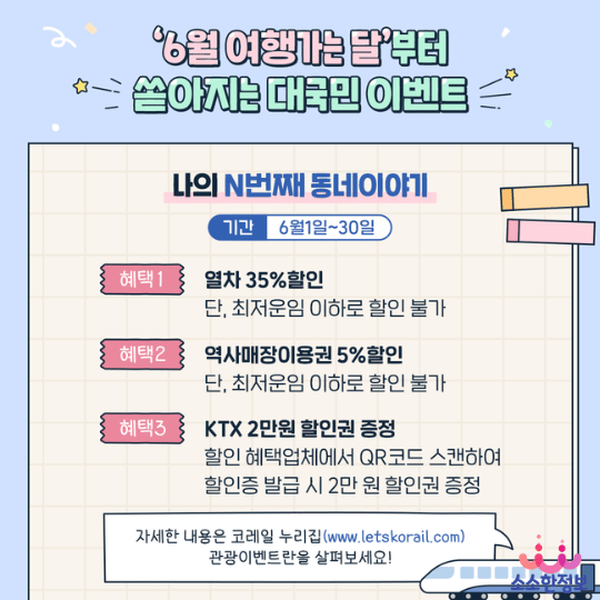 - 혜택 3: KTX 2만 원 할인권 증정 (할인 혜택업체에서 QR코드 스캔하여 할인증 발급 시 2만 원 할인권 증정)