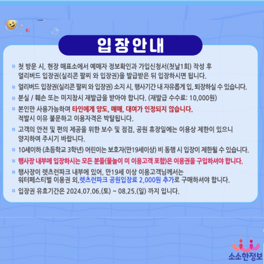 현재 선착순 1000명에 한하여 무려 78% 할인된 가격으로 선착순 얼리버트 티켓할인 행사가 진행되고 있으니 좋은 가격으로 티켓 구입하시어 시원하게 물놀이를 즐겨보시기 바랍니다.