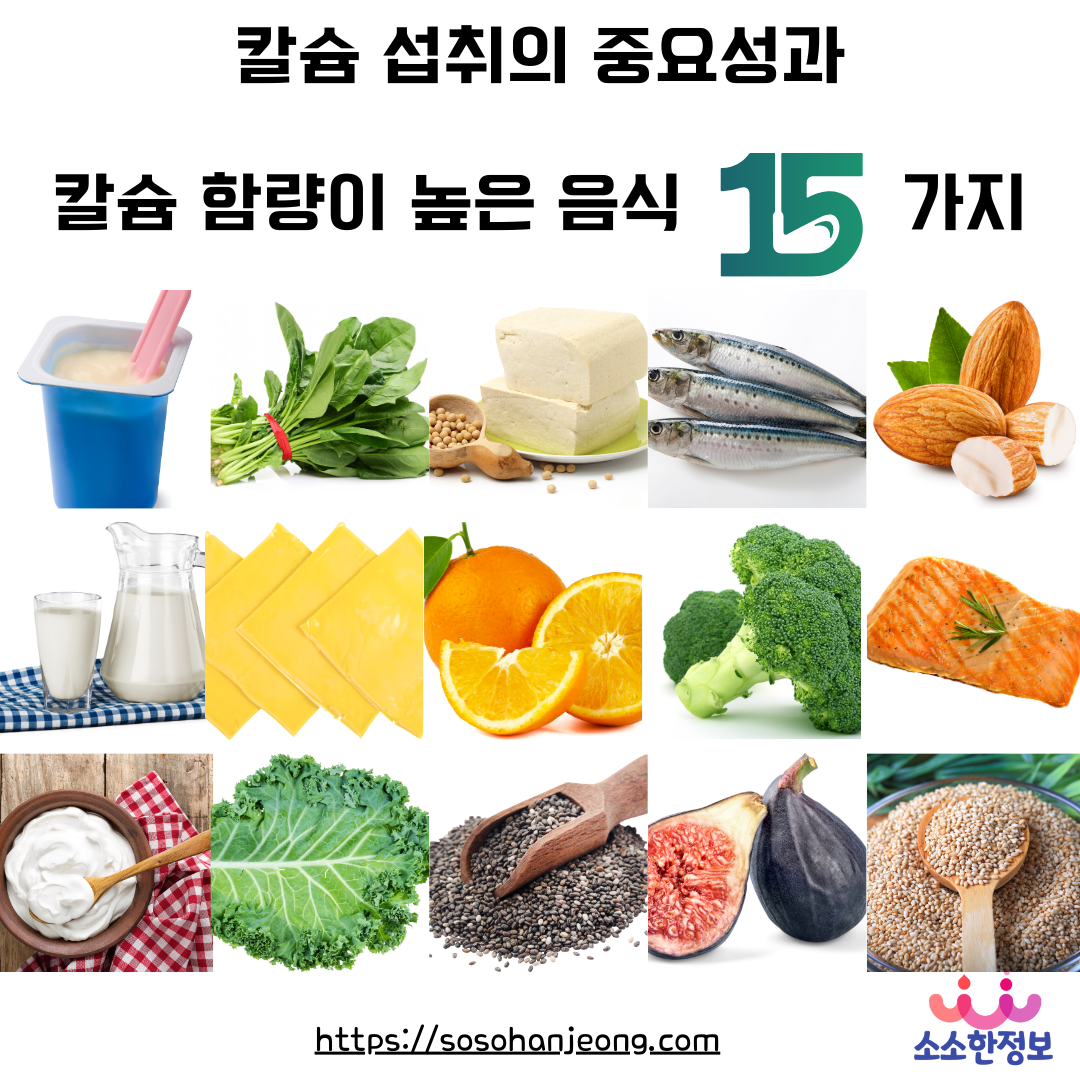 유제품은 칼슘이 풍부한 음식입니다. 칼슘을 고른 섭취를 위해서는 우유, 요구르트, 치즈를 식단에 포함시키세요. 케일, 콜라드 그린, 시금치와 같은 어둡고 잎이 많은 녹색은 비타민으로 가득 차 있을 뿐만 아니라 상당한 칼슘 함량을 자랑합니다. 쌈이나 볶음류, 찌개류에 추가하여 섭취하시기 바랍니다. 두부는 칼슘의 우수한 칼슘의 원천이다. 샐러드 또는 올리브류를 사용하여 굽기, 볶기, 찌개에 첨가하시기 바랍니다. 정어리는 칼슘 함량이 매우 높습니다. 샐러드나 간식에 추가하기 위해서 뼈가 있는 정어리 통조림을 선택하여 쉽게 섭치 할 수 있습니다. 칼슘함량이 높은 견과류 인 아몬드는 생으로 먹거나 우유에 넣거, 샐러드로 섭취하면 됩니다. 칼슘함량이 높은 액체류입니다. 매일 한 컵씩 마시거나 과일이나 견과류와 섞어 섭취하면 칼슘 섭취가 강화됩니다. 칼슘함량이 높고 간식으로 먹거나 체다, 모차렐라 또는 페타와 같은 다양한 치즈로 만들고 여러 음식에 추가해 즐겨보세요. 오렌지는 칼슘 섭취에 기여한다. 신선한 오렌지 주스나 간식이나 간식을 즐기세요..