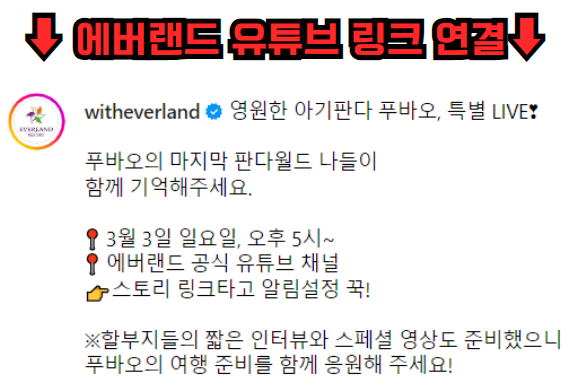 3월 3일까지 에버랜드 판다 월드에서 공개적으로 볼 수 있는 푸바오의 마지막 모습을 담기 위해 많은 사람들의 아쉬움을 달래고자 라이브 방송을 진행할 예정이라고 밝혔다.