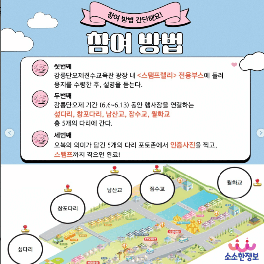 2. 강릉단오제 기간(6.6~6.13) 동안 행사장을 연결하는 <섶다리, 창포다리, 남산교, 잠수교, 월화교> 총 5개의 다리에 간다.