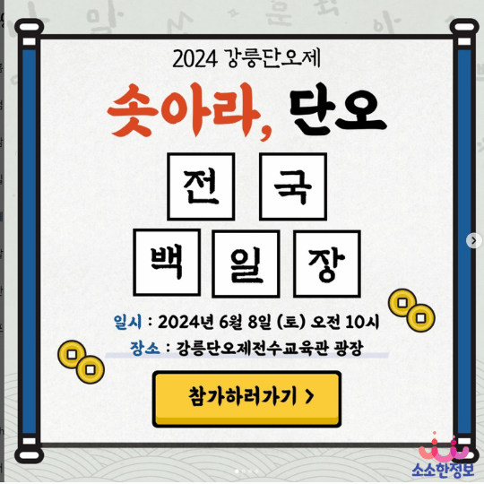 특히 강릉단오제와 관련된 해설을 들을 수 있는 프로그램 및 백일장 행사가 선착순 사전접수 중에 있으며 다양한 이벤트가 마련되어 있으니 확인 후 신청하시어 행사를 즐기시기 바랍니다.