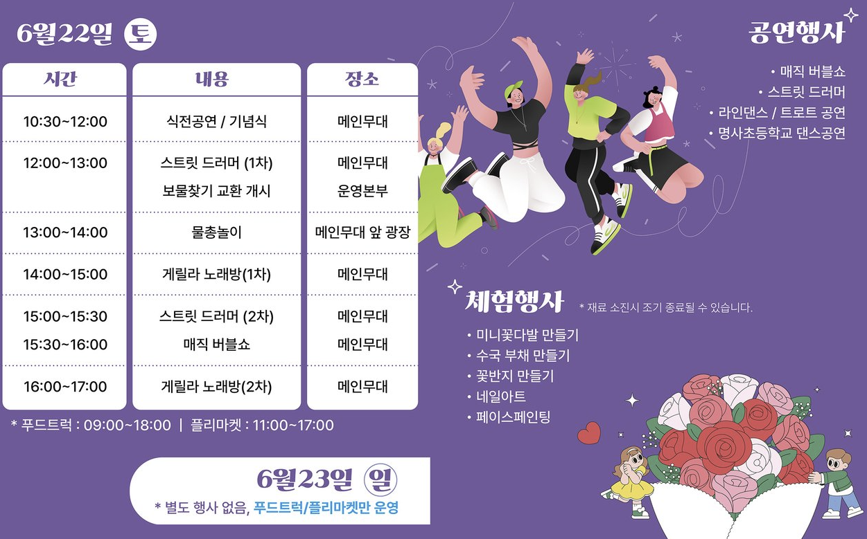 🌼 주요행사 : 축하공연, 게릴라 노래방, 보물찾기, 물총놀이, 체험행사, 푸드트럭, 플리마켓 등
