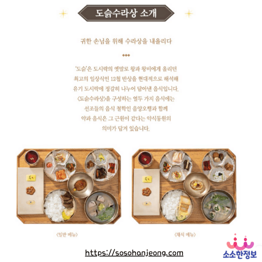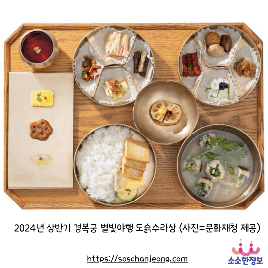 궁궐 부엌인 소주방에서 전통 국악공연을 관람하면서 궁중음식 '도슭수라상'을 직접 먹으며 체험합니다. 이때 '도슭수라상'은 조선시대 왕과 왕비가 받았던 12첩 반상을 현대적으로 재해석해 유기 도시락에 담아 제공된 것을 체험하게 됩니다. 특히 올해부터 채식 메뉴가 새로 준비되었기에 개인적인 취향에 맞추어 선택하면 됩니다.