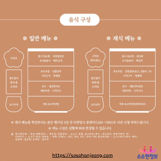 - 채식메뉴를 원하시는 분은 참여일 3일 전까지 티켓링크 콜센터(1588-7890)를 통해 사전 신청.
