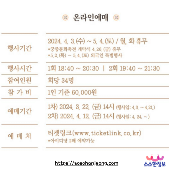 2024 경복궁 별빛야행 상반기 행사 참여를 위한 온라인 입장권 예매는 3월 22일(금)과 4월 12일(금) 두 번으로 나뉘어 진행된다.