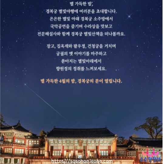 2024 경복궁 별빛야행 상반기 행사일정이 공개되었다. 2024 경복궁 별빛야행 상반기 행사는 4월 3일부터 5월 4일까지 개최된다.