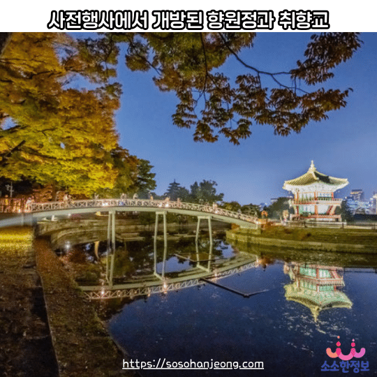 특히 야경 탐방 시 우리나라 최초로 전기가 점등됐던 건청궁과 향원정에서는 근대 문물을 적극적으로 수용하던 고종의 이야기를 담은 극을 관람할 수 있습니다. 그리고 별빛야행의 프로그램의 최고로 손꼽히는 취향교를 건너며 향원정의 야경을 즐길 수 있습니다. 향원정의 야경은 조명과 조화를 이뤄 낮과는 또 다른 특별한 정취를 느낄 수 있습니다.