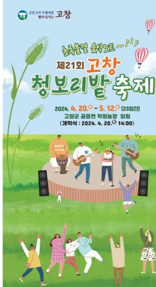2024 고창청보리밭축제가 2024년 4월 20일(토) ~ 5월 12일(일)까지 23일간 고창군 공음면 학원농장 일원에서 진행됩니다.