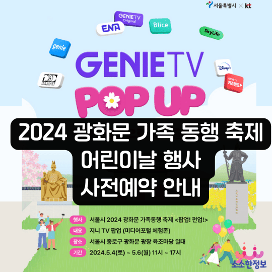 서울특별시와 KT가 함께 하는 2024 광화문 가족 동행 축제 팝업! 펀업! 축제가 2024년 5월 4일(토) ~ 5월 6일(토)까지 광화문 광장에서 진행됩니다. 특히 일부 프로그램은 사전예약 후 참여할 수 있으므로 하단 사이트를 확인하시기 바랍니다.