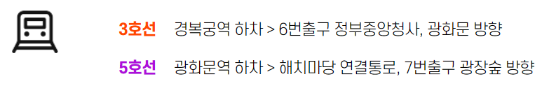 ※ 24. 5. 4.(토) 광화문광장 놀이마당에서 진행되는 서울페스타 행사로 인해 지하철 광화문역 9번 출구 폐쇄될 수 있습니다. 우회 출구 이용(광장 가까운 출구 7번)