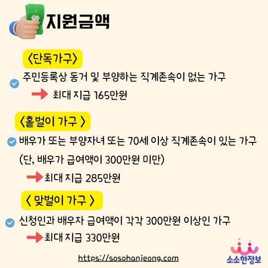 조건에 해당될 경우 단독가구 165만 원, 맞벌이가구 330만원까지 받을 수 있다.