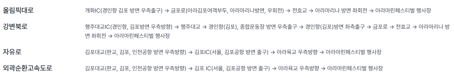 🚄9호선 개화역 2번 출구로 나와서 개화역광역환승센터 정류장까지 걷기 (약 26m 1분) → 마을버스 16번 승차 후 11개 정류장 이동(아라뱃길 김포터미널 하차) → 아라마린페스티벌 행사장