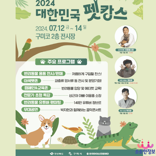 구미시 구미코에서 반려동물들의 위한 '2024 대한민국 펫캉스'가 07월 12일(금) ~ 7월 14일(일)까지 진행됩니다.