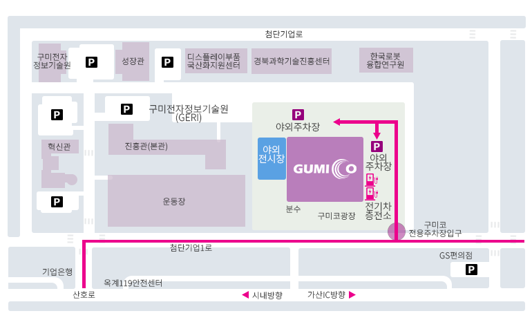 특징 : 구미코 야외주차장 입구로 진입, 주차 후 2층 출입구 사용