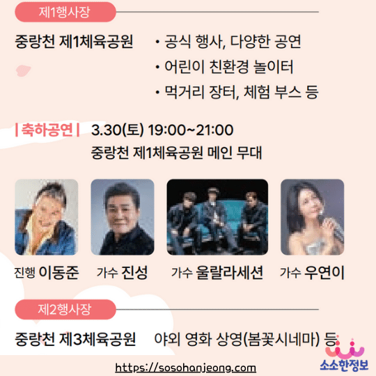 | 3월 30일(토)~ 3월 31일(일) | 공식행사, 초청공연, 구립예술단 공연 등 다양한 문화예술공연 | 중랑천 제1체육공원 (제1행사장) |