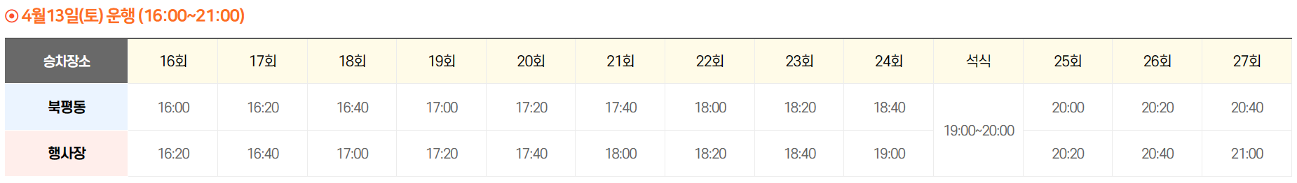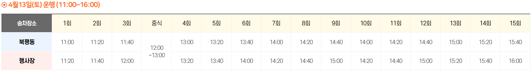- 운행일시 : 4. 12.(금) ~ 4. 14. (일) 11시 ~ 20시 / 4.13.(토) -> 21시까지 연장 운행