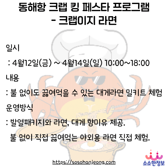 동해문화관광재단 주관으로 개최되는 동해항 크랩킹 페스타가 2024년 4월 12일(금) ~ 4월 15일(일)까지 동해러시아대게마을 일원에서 진행됩니다.