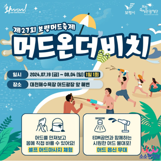 제27회 보령머드축제가 2024년 7월 19일(금)~ 8월 4일(일)까지 17일간 대천해수욕장 일원 보령머드엑스포광장에서 진행됩니다.