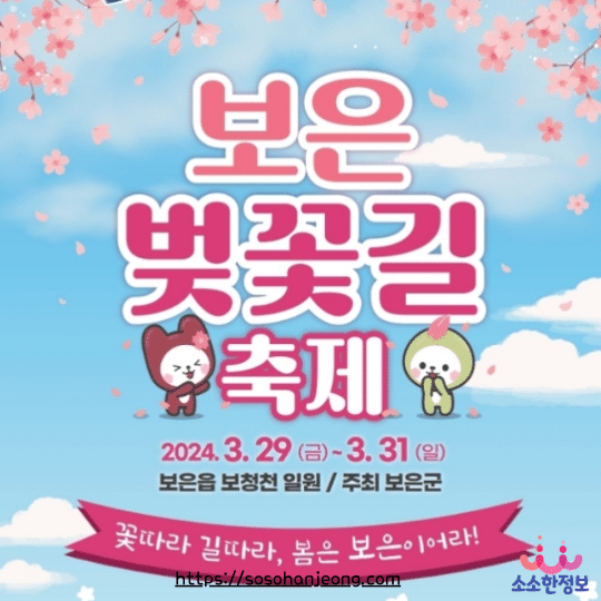 2024 보은 벚꽃길 축제가 "꽃 따라 길 따라, 봄은 보은이어라 (꽃·길·봄, 보은!)! 보청천 벚꽃길"을 테마로 하여 2024년 3월 29일(금)~ 3월 31일(일) 까지 보청천 일원에서 개최됩니다.