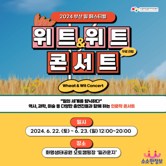 세계 3대 식량 작물 중 하나인 '밀'을 이용한 다양한 체험 프로그램 및 행사가 2024년 6월 22일(토) ~ 6월 23일(일)까지 2일간 화명생태공원 연꽃단지 및 오토캠핑장에서 진행됩니다.