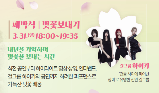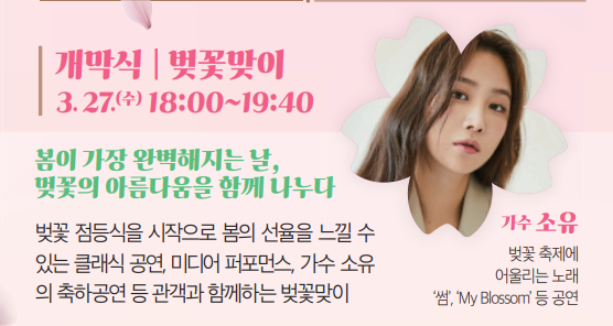 벚꽃 화관, 팔찌 만들기, 체험존과 플리마켓, 포토존, 야간 벚꽃조명 등이 마련되어 있습니다