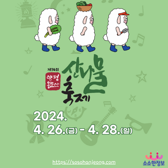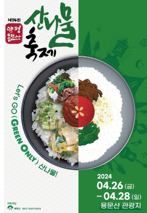 양평 용문산에서 양평의 우수산 산나물을 이용한 2024 양평 용문산 산나물축제를 2024년 4월 26일(금)~ 4월 28일(일)까지 용문산 관관단지 일원에서 진행합니다.