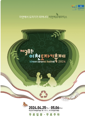 2024년 제38회 이천도자기축제가 '자연에 도자기가 피어나다, 이천에코세라믹스'를 주제로 2024년 4월 25일(목)~ 5월 6일(월)까지 이천도자예술마을(예스파크), 사기막골 도예촌 일원에서 진행됩니다.