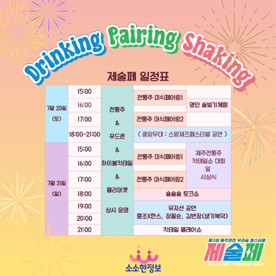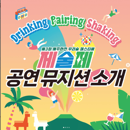 로컬 전통주를 다양하게 즐기는 제주한잔 우리술 대축제인 제주한잔 우리술 페스티벌이 2024년 7월 20일(토)~ 7월 21일(일)까지 제주도 이호테우 해수욕장에서 진행됩니다.