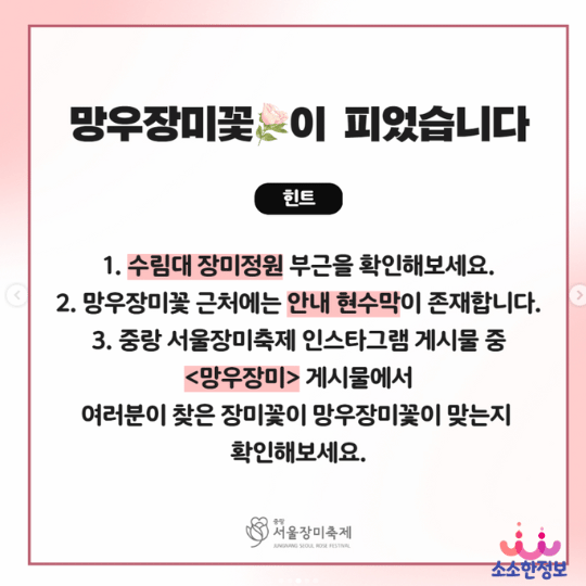 3. 중랑 서울장미축제 인스타그램 게시물 중 <망우장미> 게시물에서 여러분이 찾은 장미꽃이 망우장미꽃이 맞는지 확인해보세요.