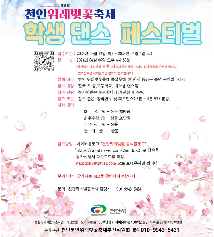 ☎ 문 의 : 010-9943-5431 (천안위례벚꽃축제 담당자)
