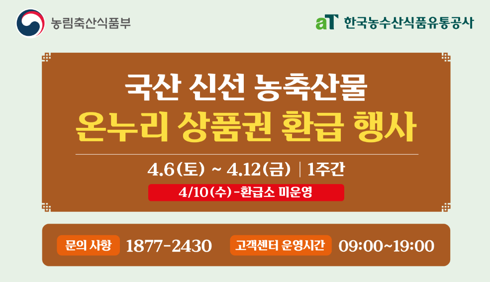 농림축산식품부는 농축산물 구매에 따른 경제적 부담을 완화하기 위해 기존에 진행했던 행사의 기간을 늘려 4월 6일부터 12일까지 전국 50개 전통시장에서 '4월 전통시장 온누리 상품권 환급행사'를 진행한다고 밝혔습니다.