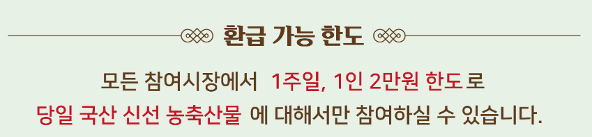 이번 환급행사를 이용하시려면 행사가 열리는 시장을 확인 하신 후 신선한 국내산 농축산물을 구매하시면 됩니다. 그 후, 영수증과 신분증을 지참하고 시장 내 환불부스로 가서 본인 확인을 한 후 온누리 상품권을 환불받으시면 됩니다.