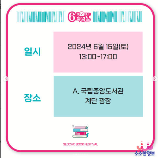 2024년 6월 15일(토) 국립중앙도서관과 서래공원 일원에서 서초 책 읽는 거리 북캉스 행사가 진행됩니다.