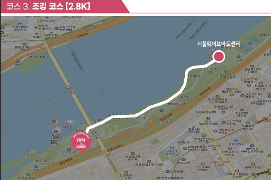 | (코스3) 한강 남단 코스 2.8Km 반포한강공원 달빛광장 ~ 서울웨이브아트센터(반환) ~ 달빛광장 |